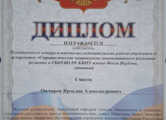 Аспирант Крымского университета культуры, искусств и туризма Ярослав Овчаров занял 1 место в Региональном... -