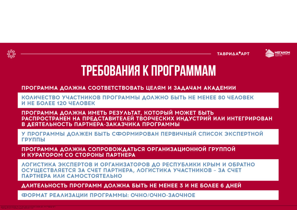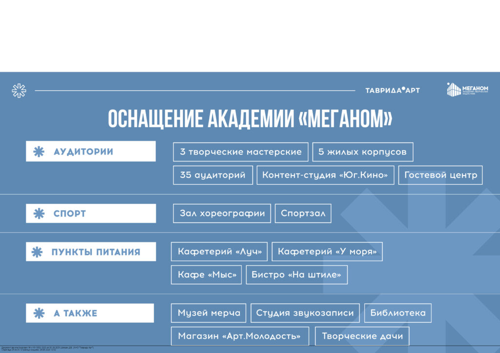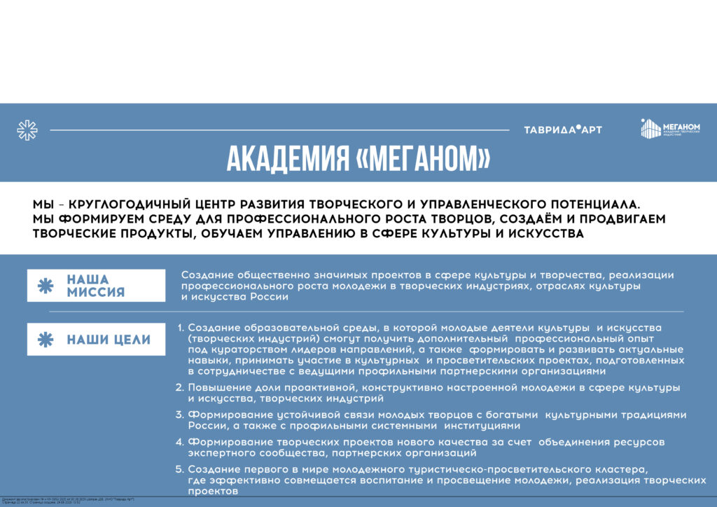 Автономная некоммерческая организация «Таврида.Арт» развивает арт-кластер «Таврида» – платформу возможностей для молодых деятелей культуры и искусства, которая объединяет Академию творческих индустрий «Меганом», образовательные заезды для молодых деятелей культуры и искусств «Таврида» (летние школы Академии творческих индустрий «Меганом»), фестиваль молодого искусства «Таврида.АРТ», федеральную сеть арт-резиденций и другие проекты.
