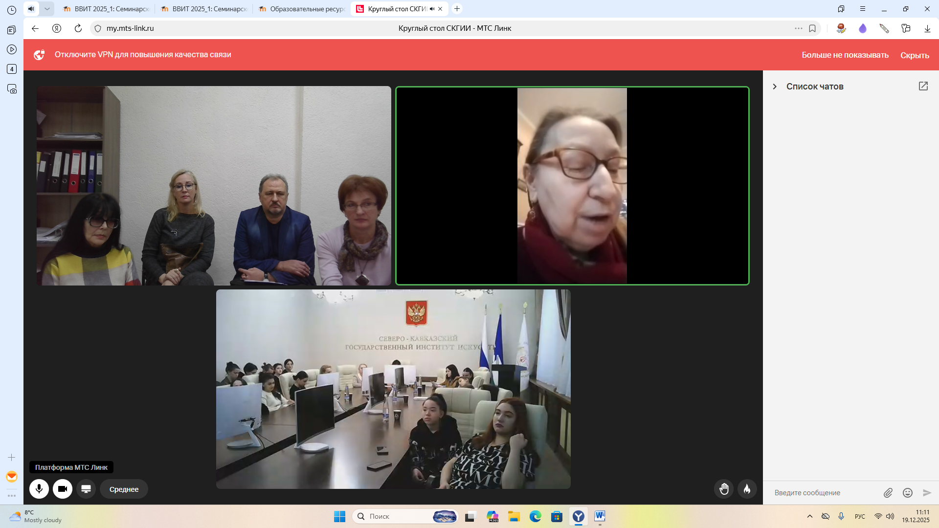 19 декабря 2025 года в онлайн-формате состоялся межвузовский круглый стол «Искусство как форма духовной культуры и социальный институт». Организатором мероприятия выступило Студенческое научное общество Северо-Кавказского государственного института искусств (г. Нальчик).