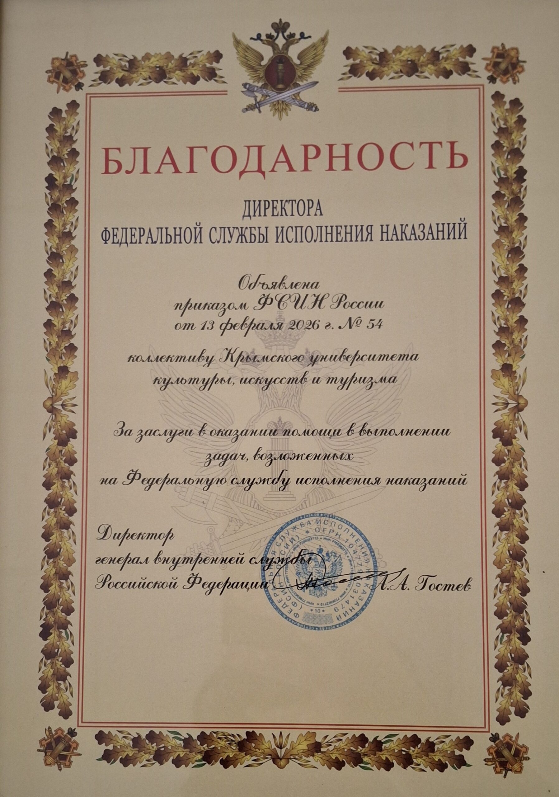 Крымский университет культуры, искусств и туризма отмечен Благодарностью директора ФСИН России