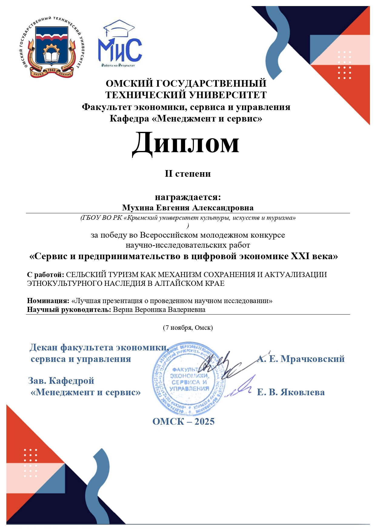 Магистранты первого курса направления подготовки  «Туризм» Евгения Мухина и Кир Шепаревич достойно представили свои научные работы на Всероссийском молодежном конкурсе научно-исследовательских работ «Сервис и предпринимательство в цифровой экономике XXI века», который  собрал более 119 работ из разных регионов России и стран ближнего зарубежья. Конкурс проводился кафедрой «Менеджмент и сервис» Омского государственного технического университета.