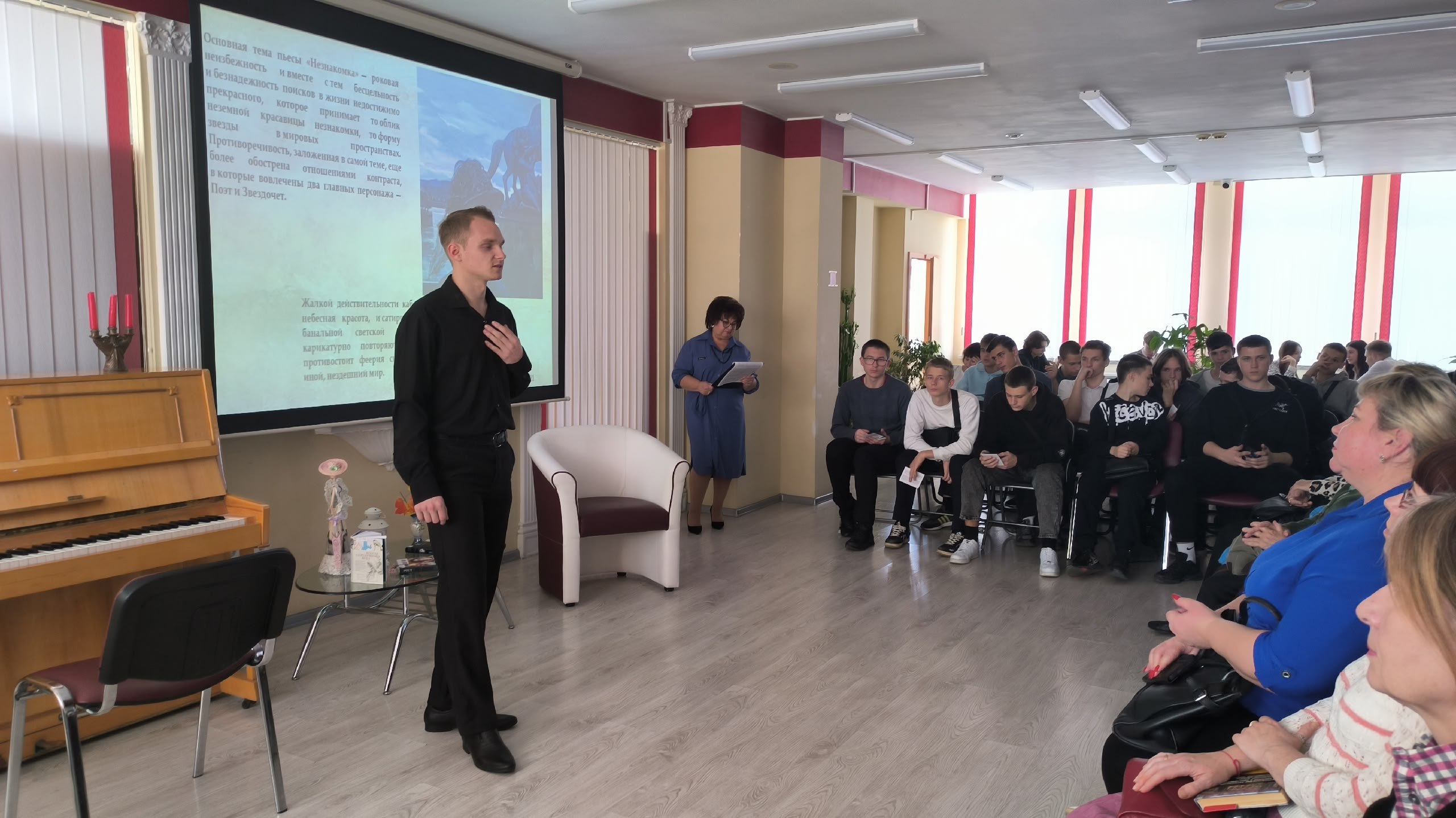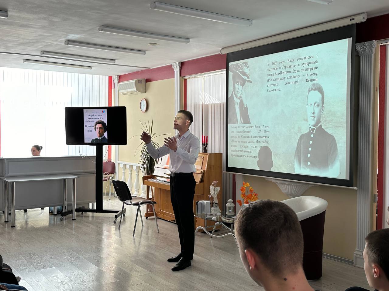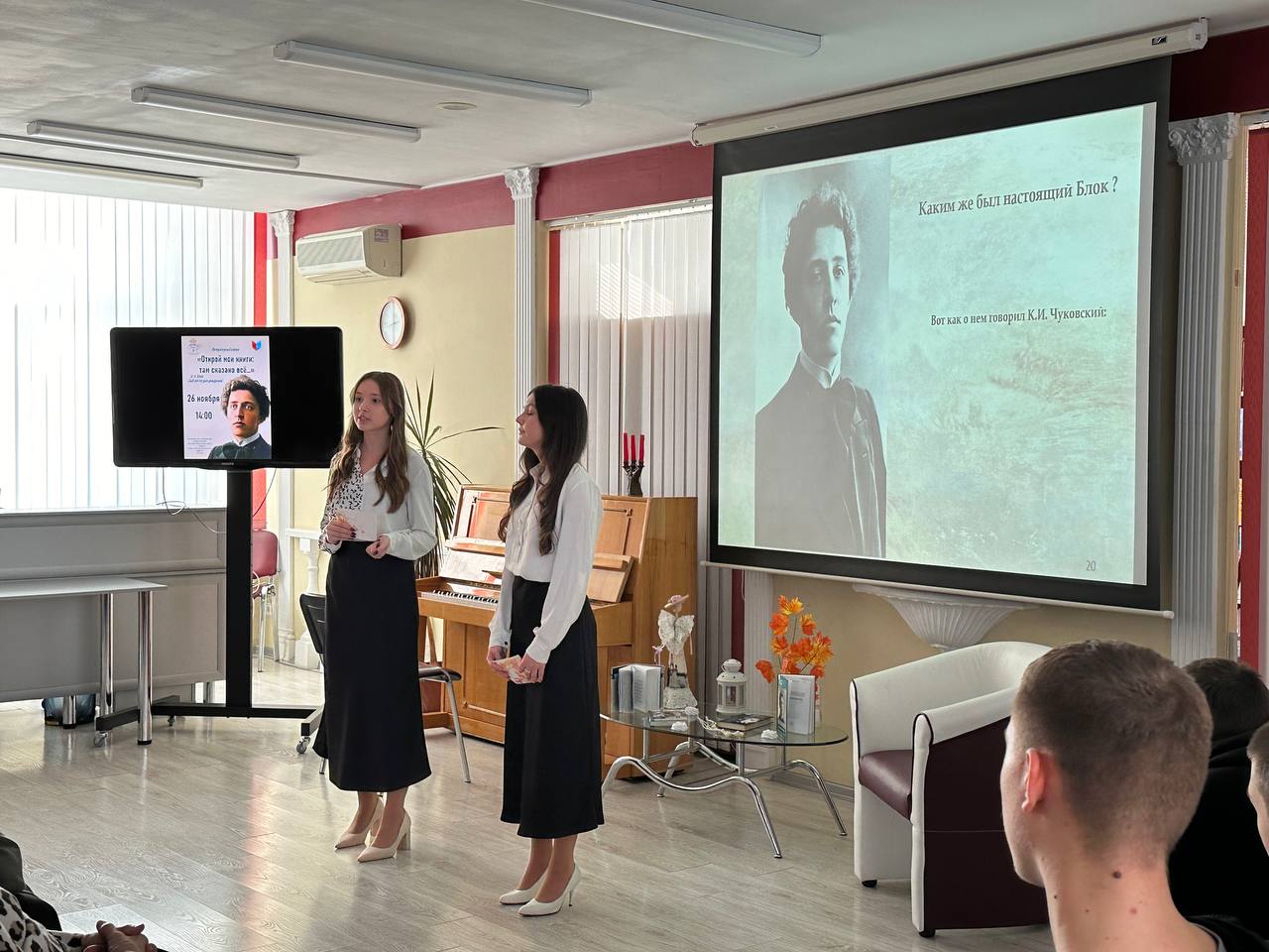 Будущие режиссеры под руководством старшего преподавателя кафедры театрального искусства Ю.А. Медведковой представили зрителям яркую программу, посвященную жизни и творчеству классика русской литературы XX века. Студенты второго курса направления подготовки «Режиссура театрализованных представлений и праздников» проникновенно исполнили стихотворения А.А. Блока. В творческой программе приняли участие: Владимир Барладян, Иван Коломийченко, Никита Швед, Артем Буряк, Мария Иевлева, София Надворная, Виктория Рудницкая. Ведущей вечера выступила София Кулик, которая провела зрителей по страницам биографии и творческого пути поэта.