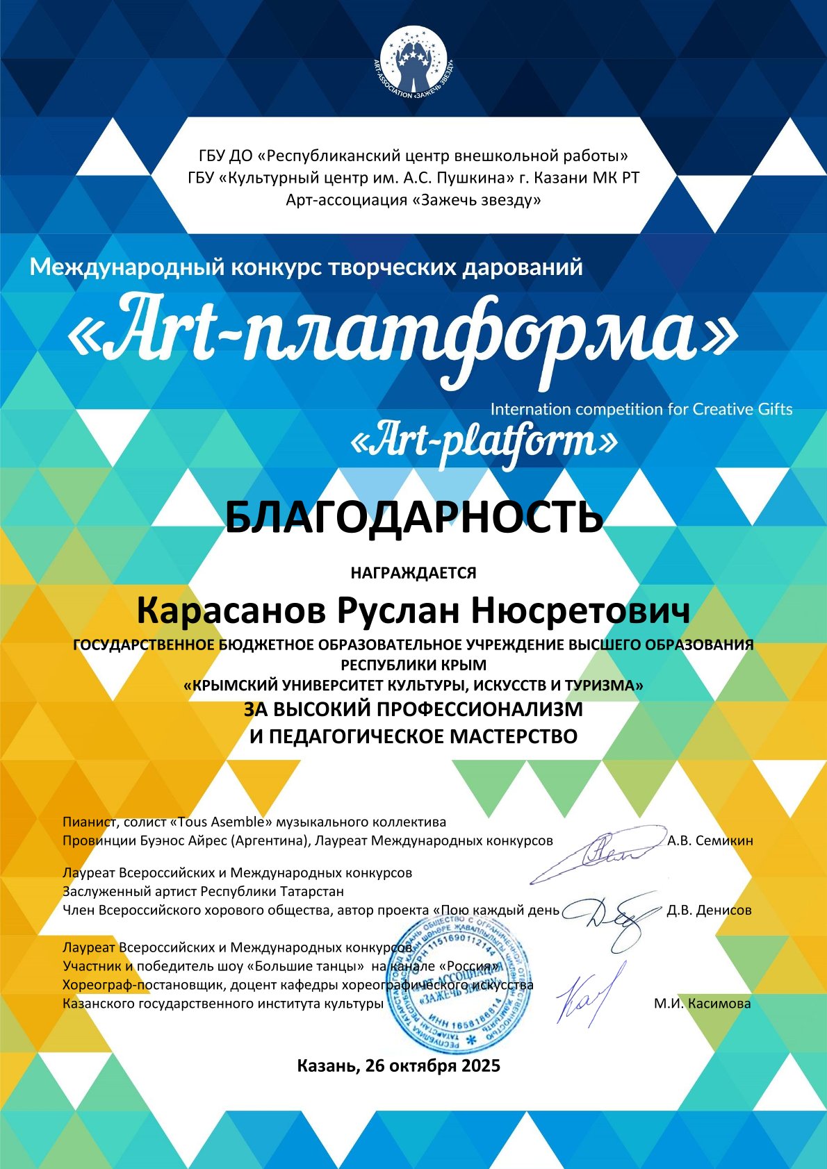 26 октября 2025 года в Казани состоялся X Международный конкурс творческих дарований «АРТ-платформа». Мероприятие, организованное Культурным центром им. А.С. Пушкина, Республиканским центром внешкольной работы и Арт-ассоциацией «Зажечь звезду», собрало талантливых участников со всей России.