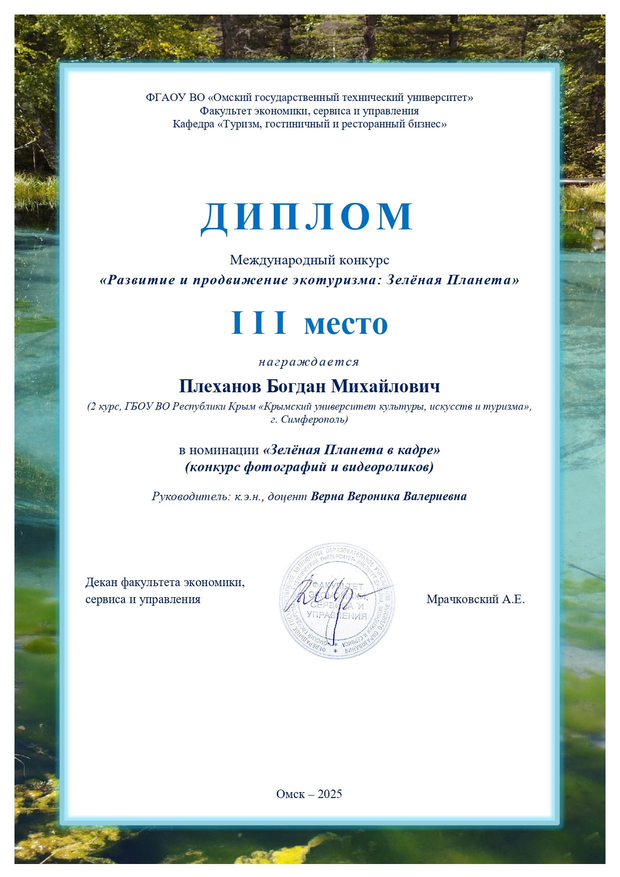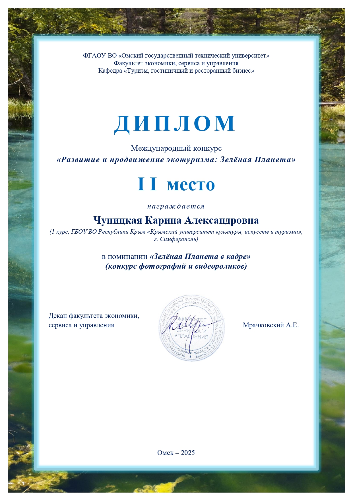 Студенты Университета успешно представили свои работы на Международном конкурсе «Развитие и продвижение экотуризма: Зеленая планета», организованном кафедрой «Туризм, гостиничный и ресторанный бизнес» Омского государственного технического университета.