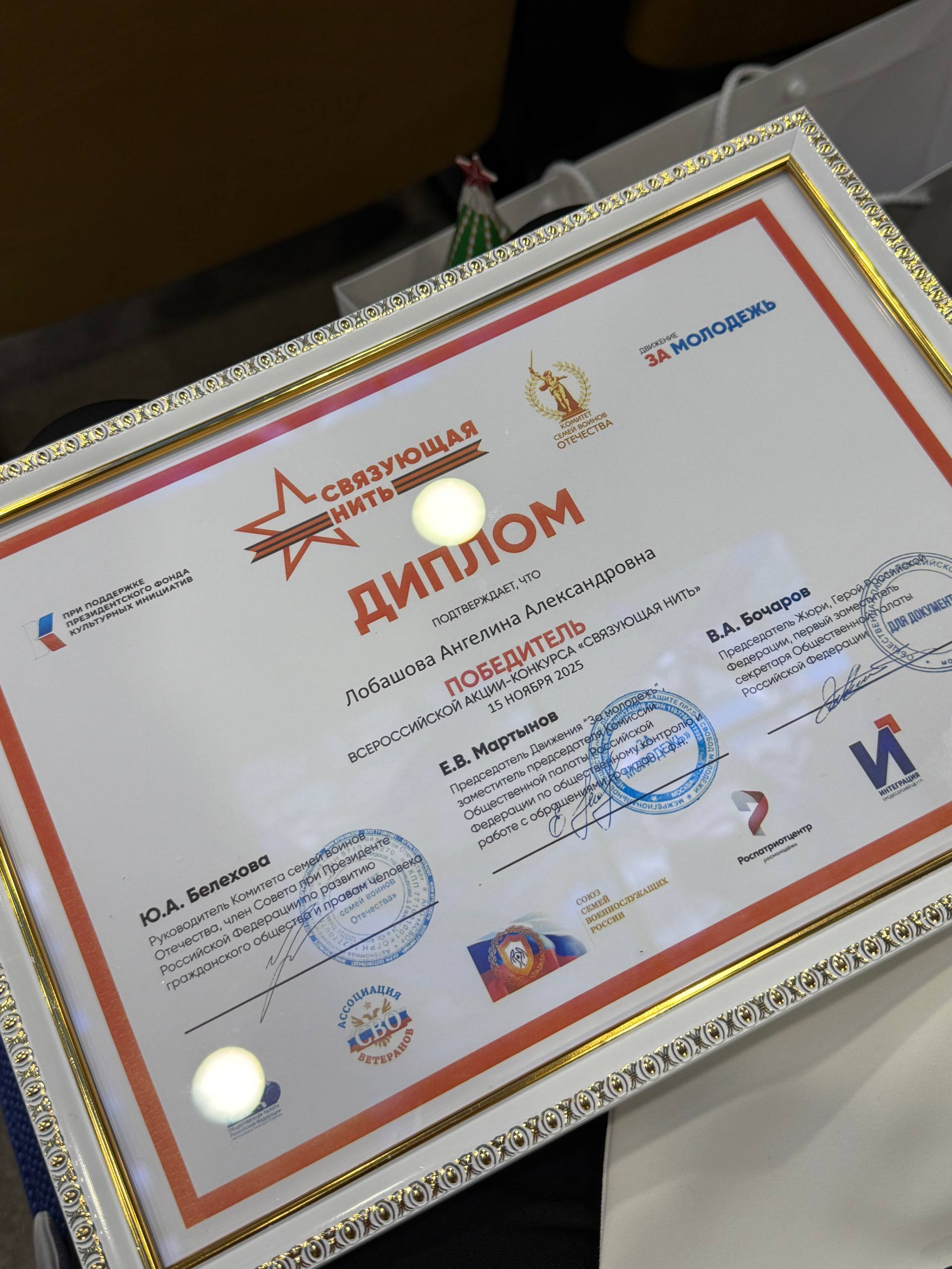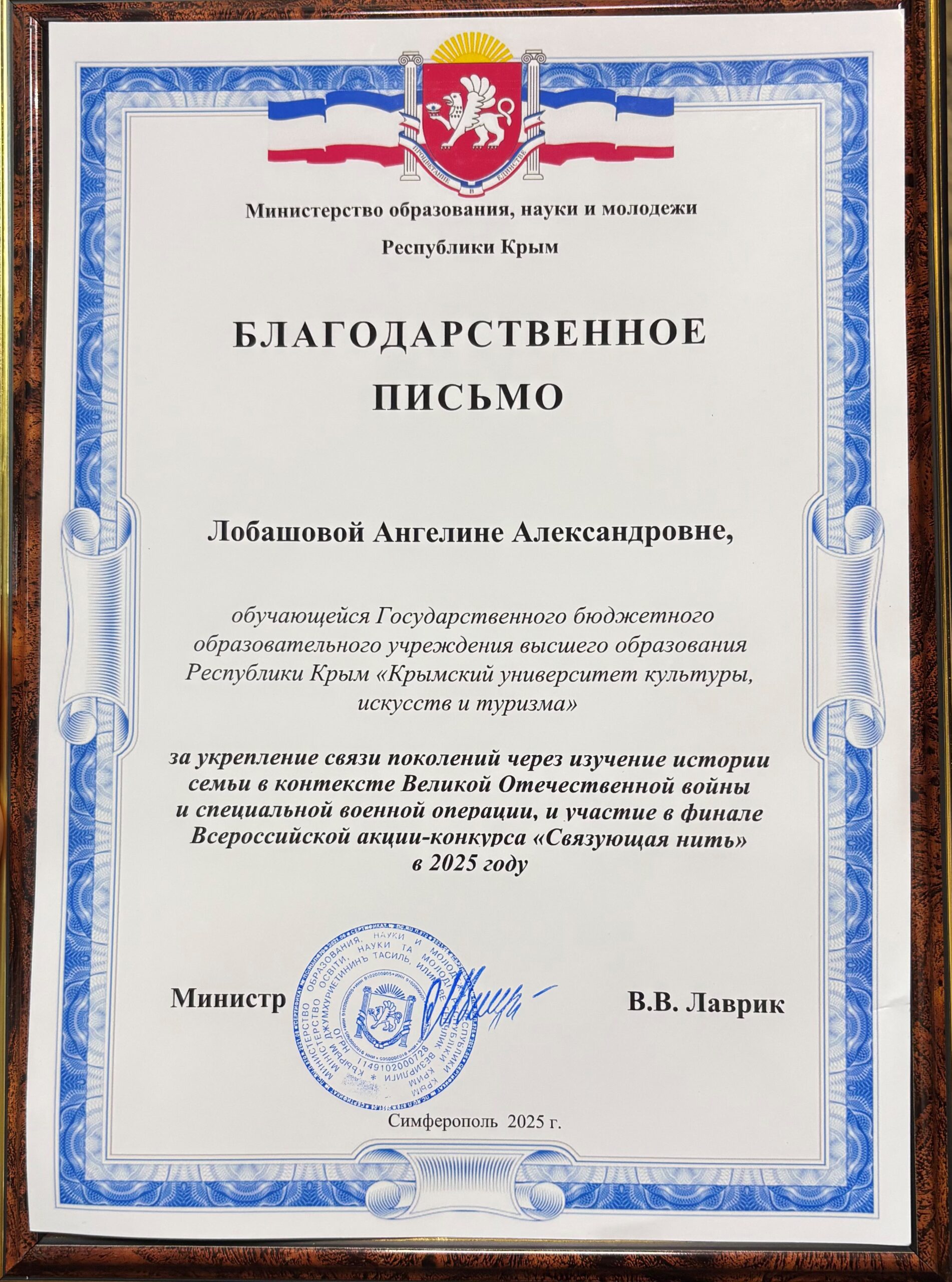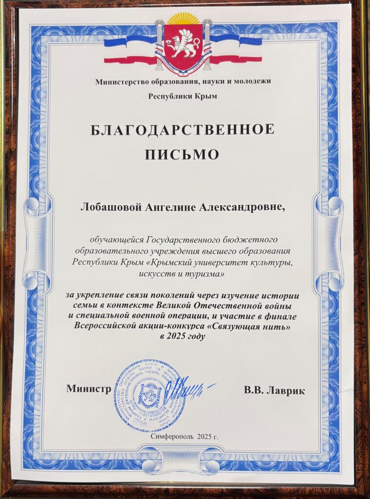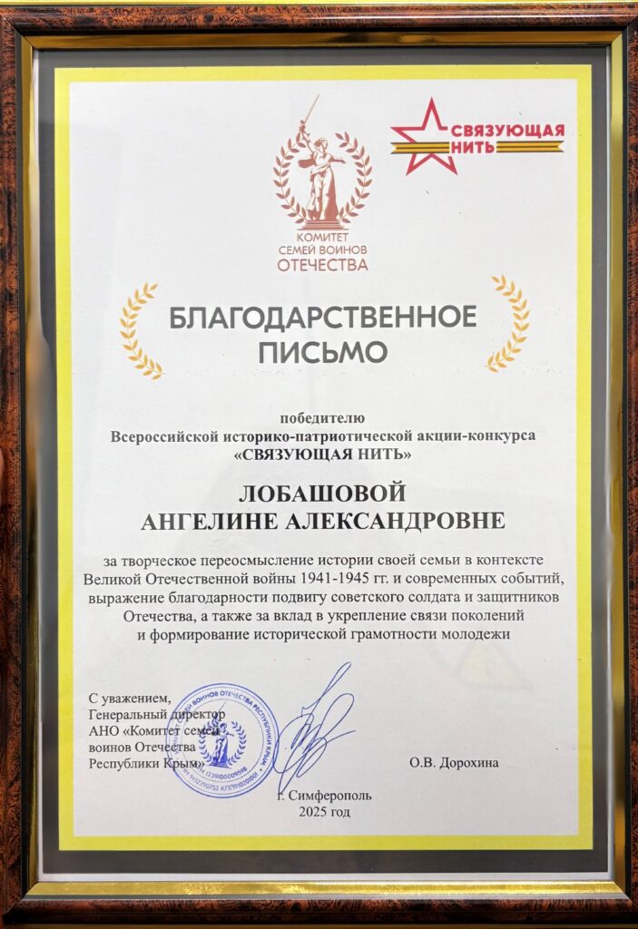 Накануне церемонии награждения в рамках мероприятий, посвящённых Дню Конституции Российской Федерации, Ангелина Лобашова была отмечена благодарственными письмами Министерства образования, науки и молодёжи Республики Крым и Комитета семей воинов Отечества Республики Крым за активную гражданскую позицию и значимый вклад в сохранение исторической памяти.