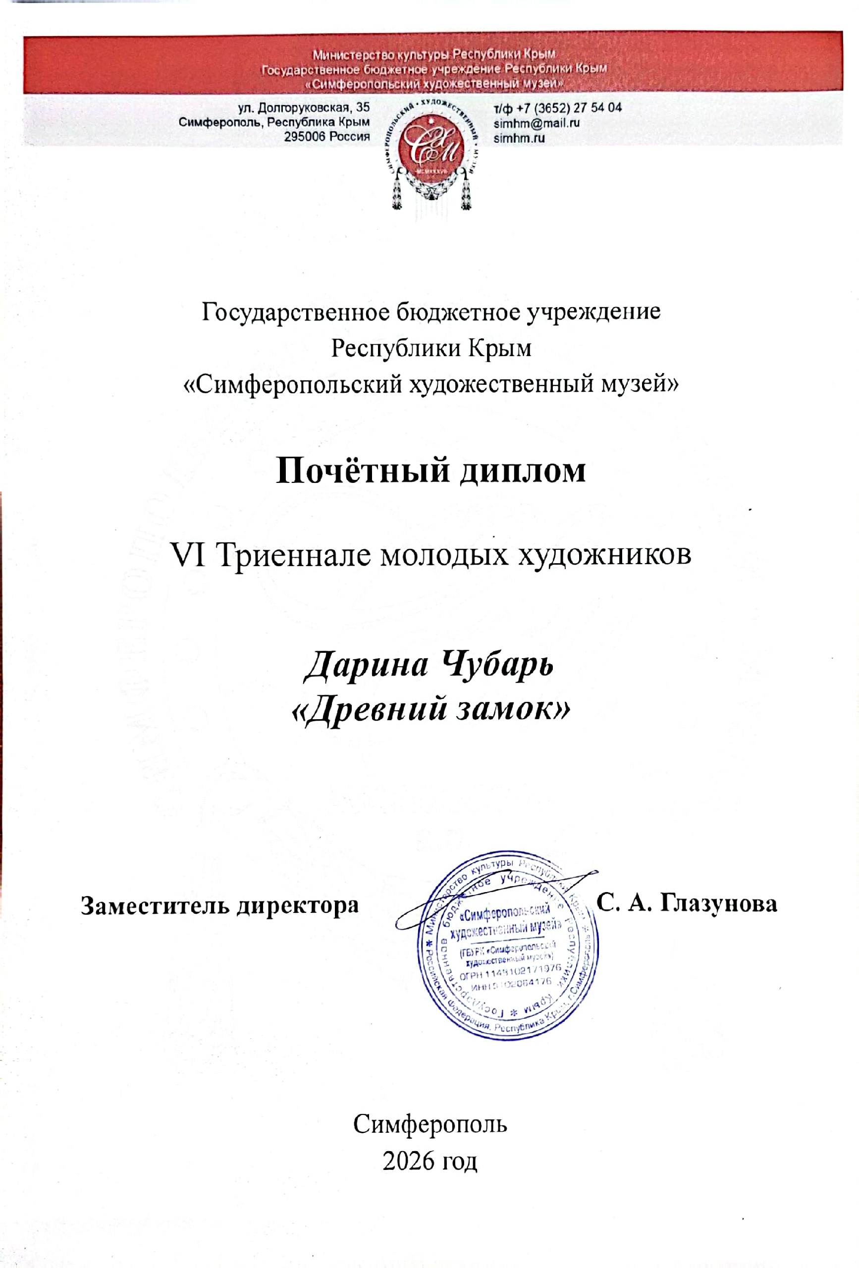 Дарина Чубарь, студентка 2‑го курса профиля «Графический дизайн», удостоена почётного диплома за картину «Древний замок».