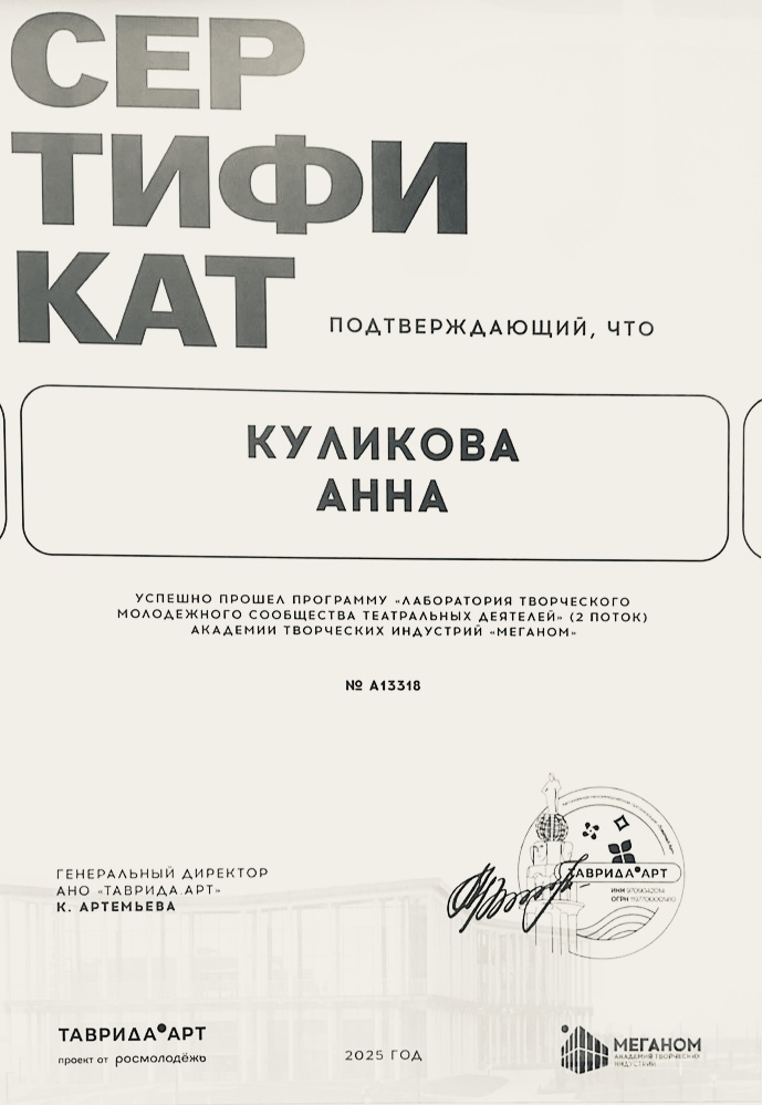 Успешное участие в престижном проекте продемонстрировали студентки кафедры театрального искусства Анна Куликова и Арина Чёрная. Обе участницы успешно прошли строгий конкурсный отбор и вошли в состав участников Второй лаборатории Творческого молодёжного сообщества театральных деятелей.