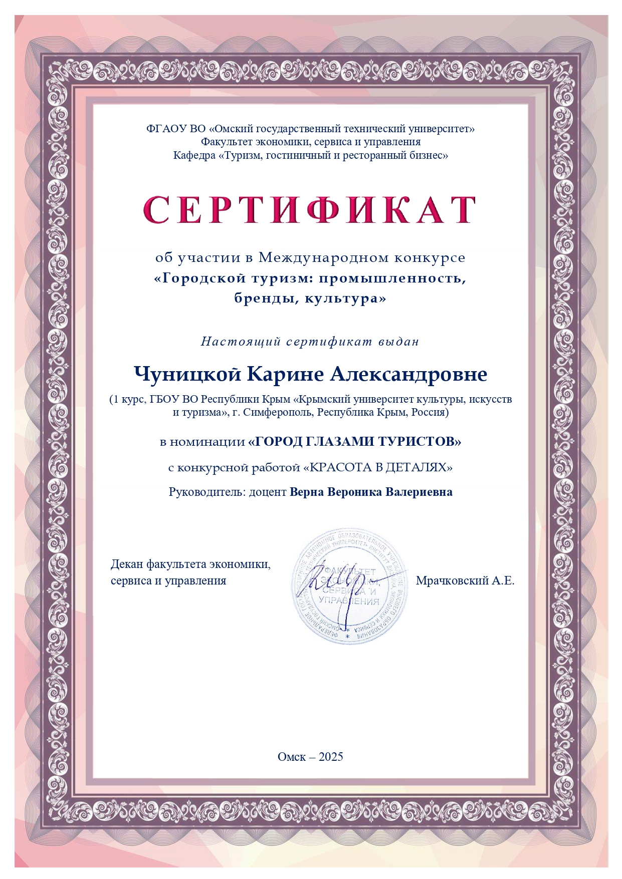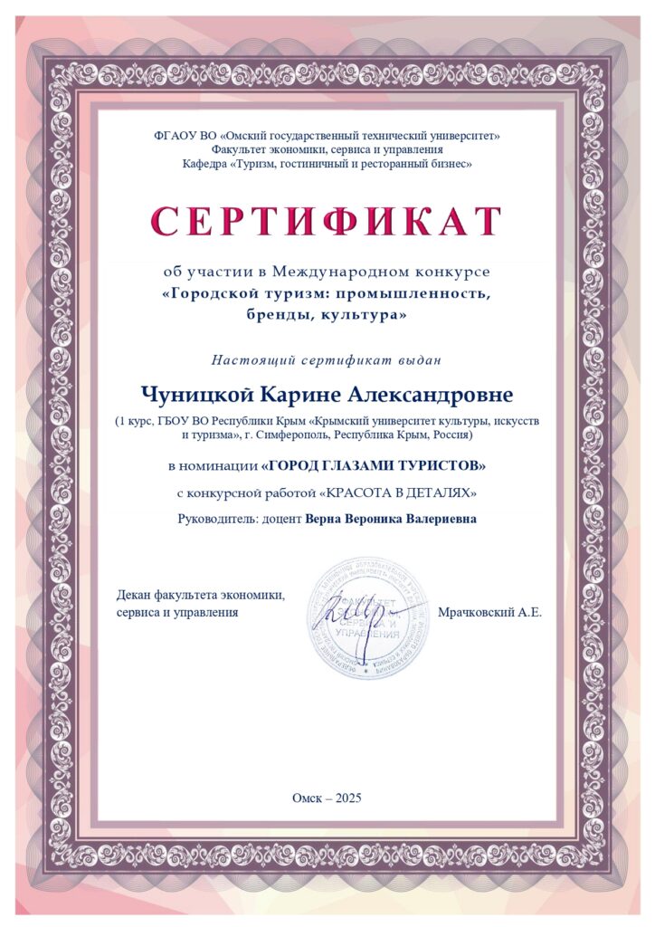 Чуницкая Карина (1 курс, направление подготовки «Туризм») отмечена сертификатом участника в номинации «Город глазами