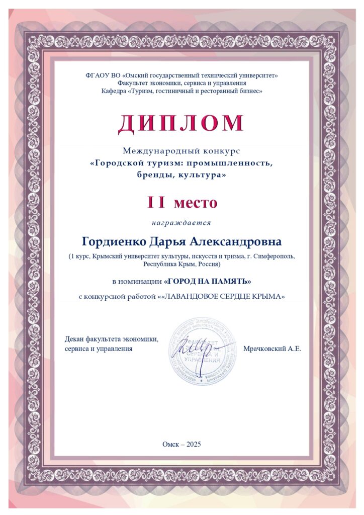 Гордиенко Дарья (1 курс, направление подготовки «Социально-культурная деятельность») получила II место в номинации «Город на память» за проект «Лавандовое сердце Крыма».