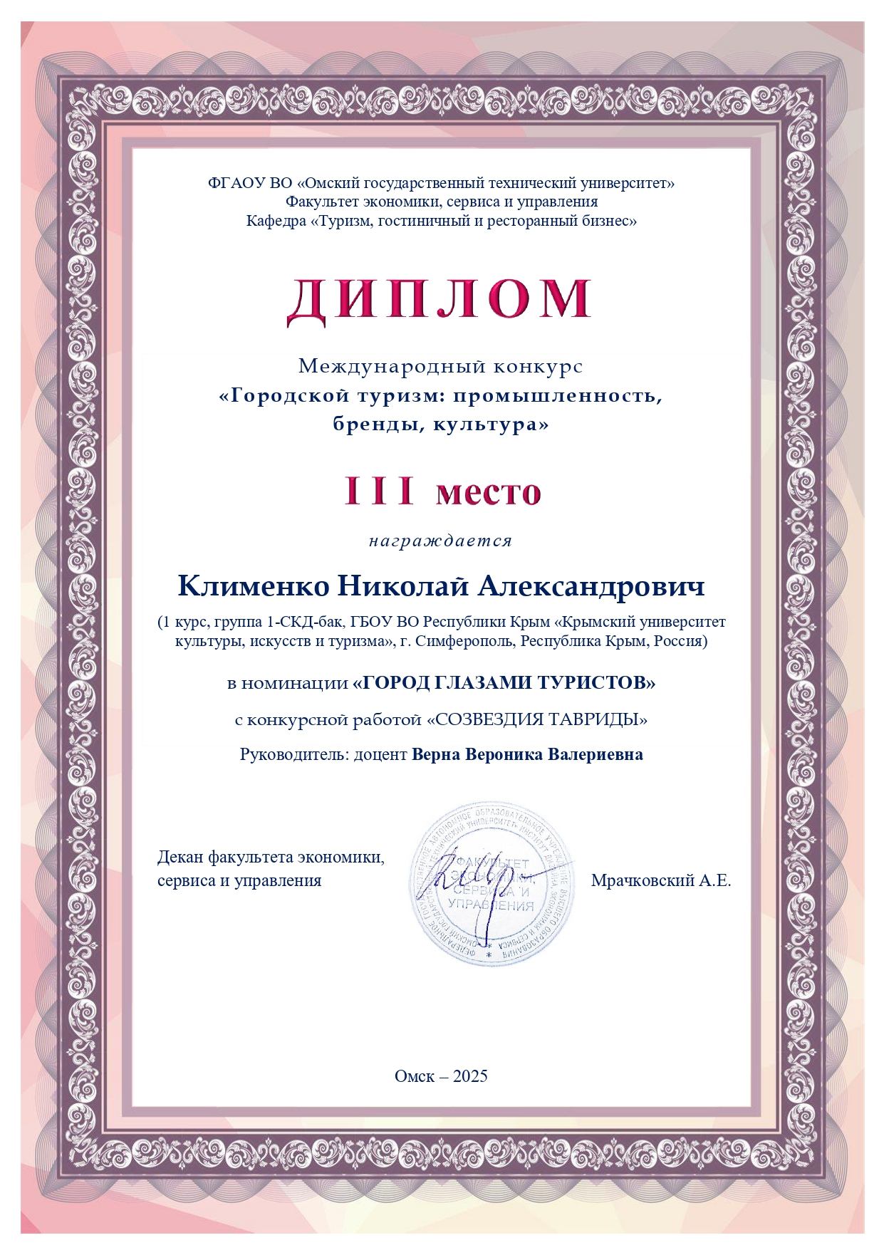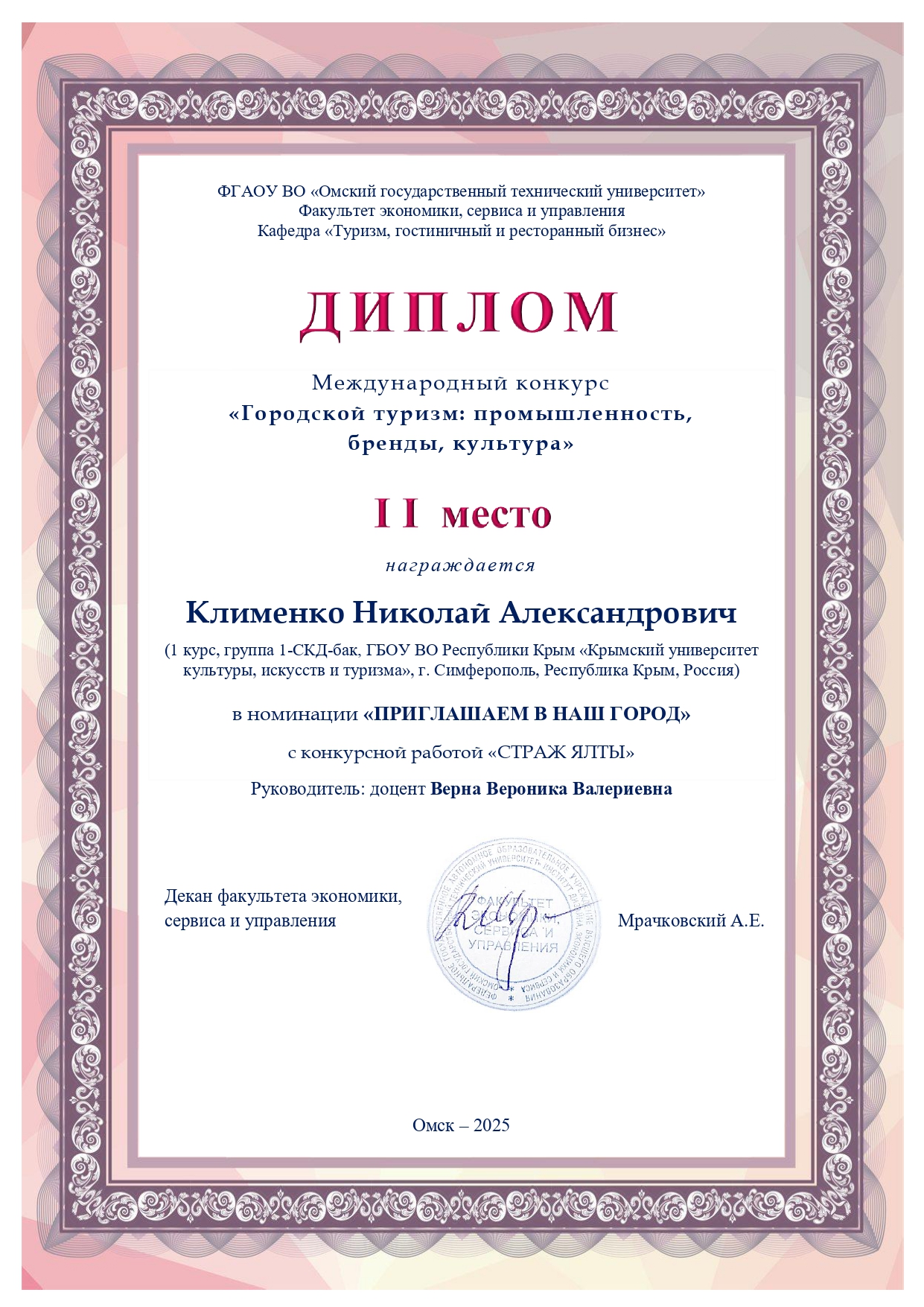 Клименко Николай (1 курс, направление подготовки «Социально-культурная деятельность») удостоен двух наград: II место в номинации «Приглашаем в наш город» за проект «СТРАЖ ЯЛТЫ» и III место в номинации «Город глазами туристов»