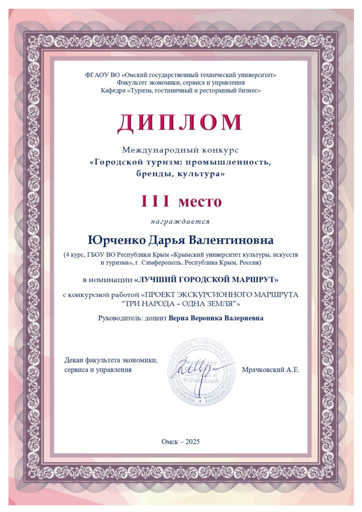за проект экскурсионного маршрута «Где начинается Крым: облик столицы полуострова» и III место в номинации «Лучший городской