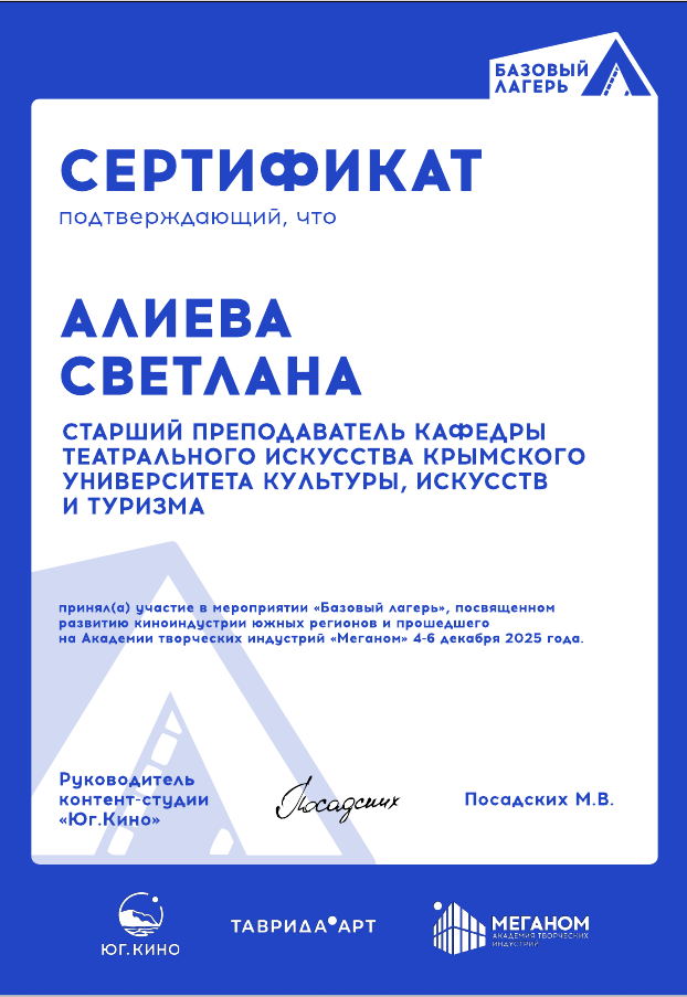 Значимое событие в сфере кинематографа состоялось на базе арт-кластера «Таврида». Старший преподаватель кафедры театрального искусства Светлана Ремзиевна Алиева приняла участие в масштабной программе «Базовый лагерь контент-студии „Юг.Кино“». Профессиональный форум собрал более 40 ключевых представителей киноиндустрии из южных регионов России. Среди участников — продюсеры, кастинг-директора, представители кинокомиссий и сервисных компаний.