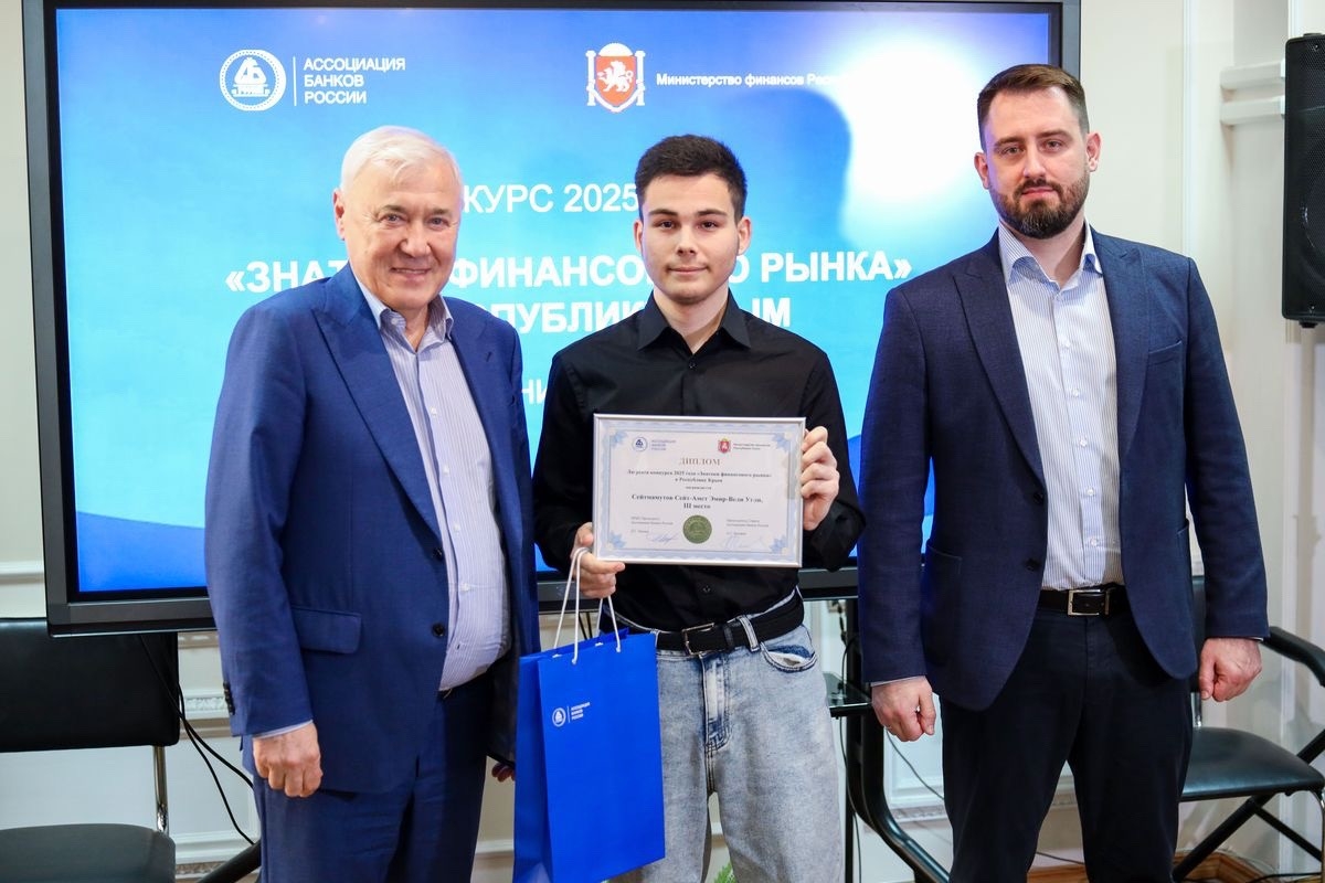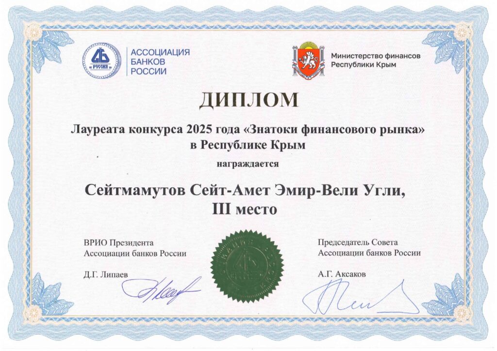 По результатам прохождения испытаний в двух этапах конкурса Сейт-Амет занял призовое III место, награжден Дипломом Лауреата конкурса 2025 года «Знатоки финансового рынка» в Республике Крым, а также ему вручен ценный приз от организаторов конкурса.