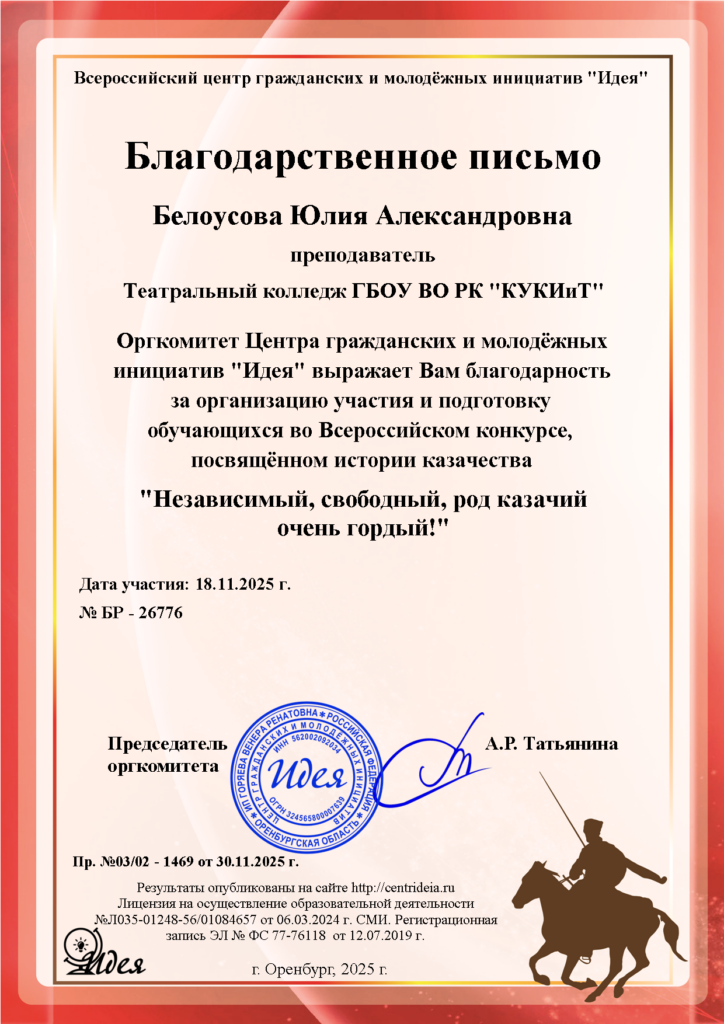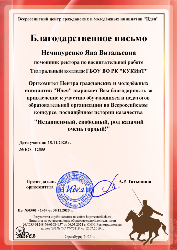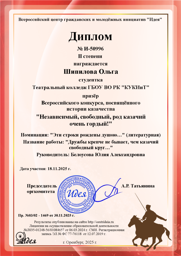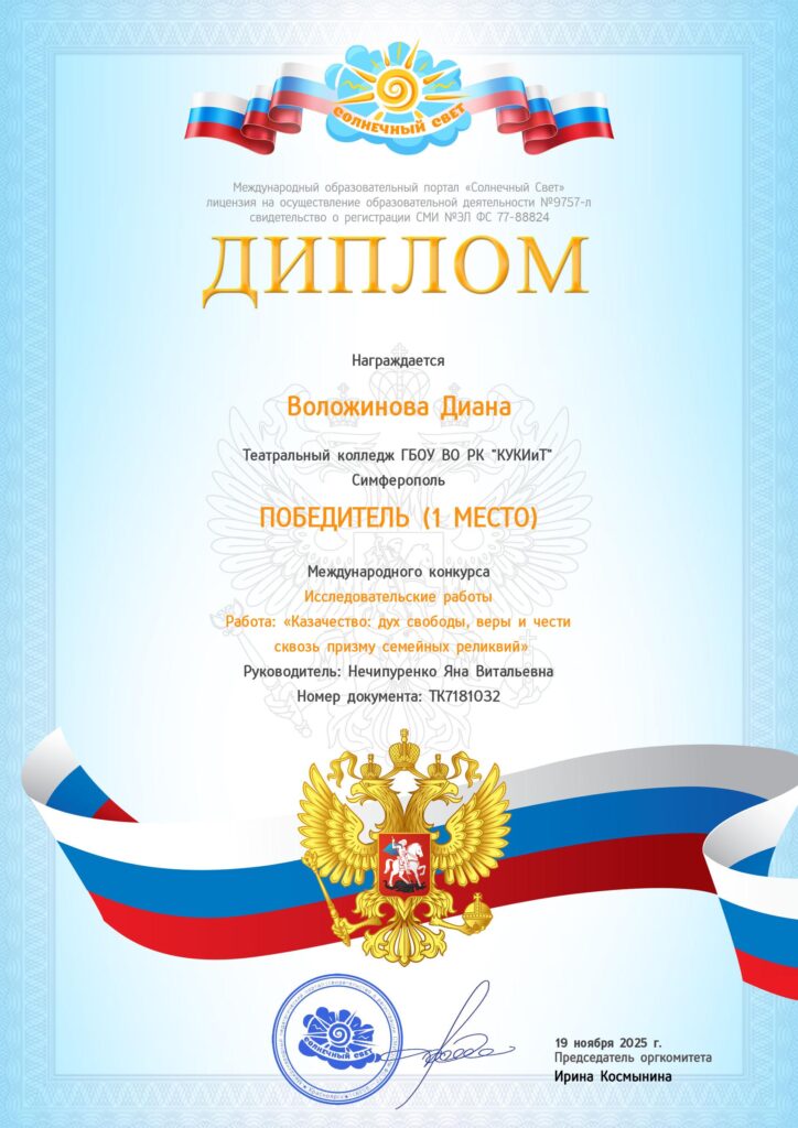 Образовательная инициатива была реализована под руководством помощника ректора по воспитательной работе Я.В. Нечипуренко совместно с преподавателем Театрального колледжа Ю.А. Белоусовой. В результате обучающиеся КУКИиТ приняли участие в двух крупных конкурсах: Международном конкурсе исследовательских работ «Казаки и казачество России» и Всероссийском конкурсе «Независимый, свободный, род казачий очень гордый!». Успехи студентов были высоко оценены жюри: лучшие работы были удостоены дипломов первой и второй степени, что подтверждает высокий уровень подготовки участников и качество организации конкурсов.