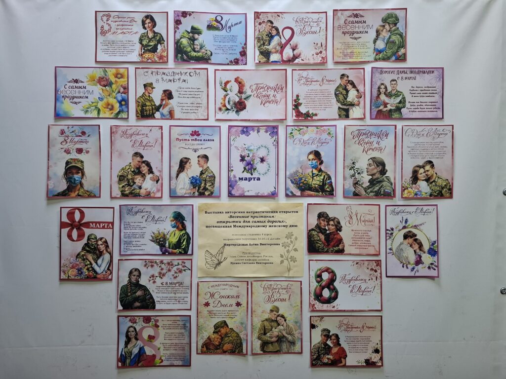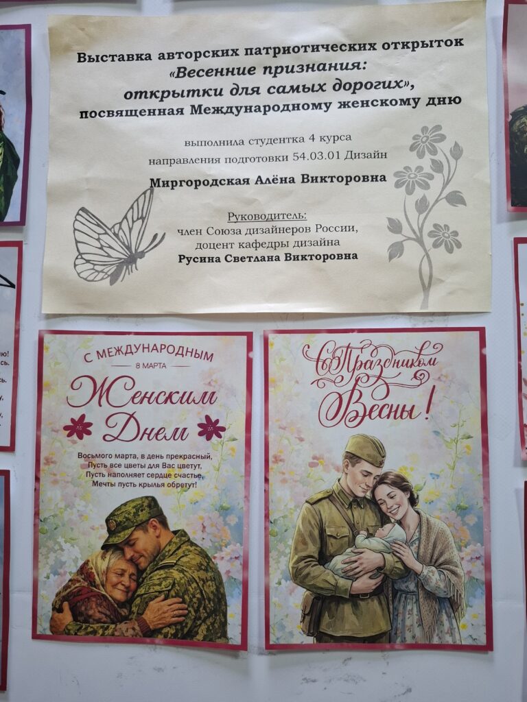 В преддверии Международного женского дня в Университете открылась уникальная выставка авторских открыток «Весенние признания: открытки для самых дорогих». Автором экспозиции стала студентка 4 курса кафедры дизайна Алёна Миргородская, а научным руководителем выступила член Союза дизайнеров России, доцент кафедры Светлана Русина.