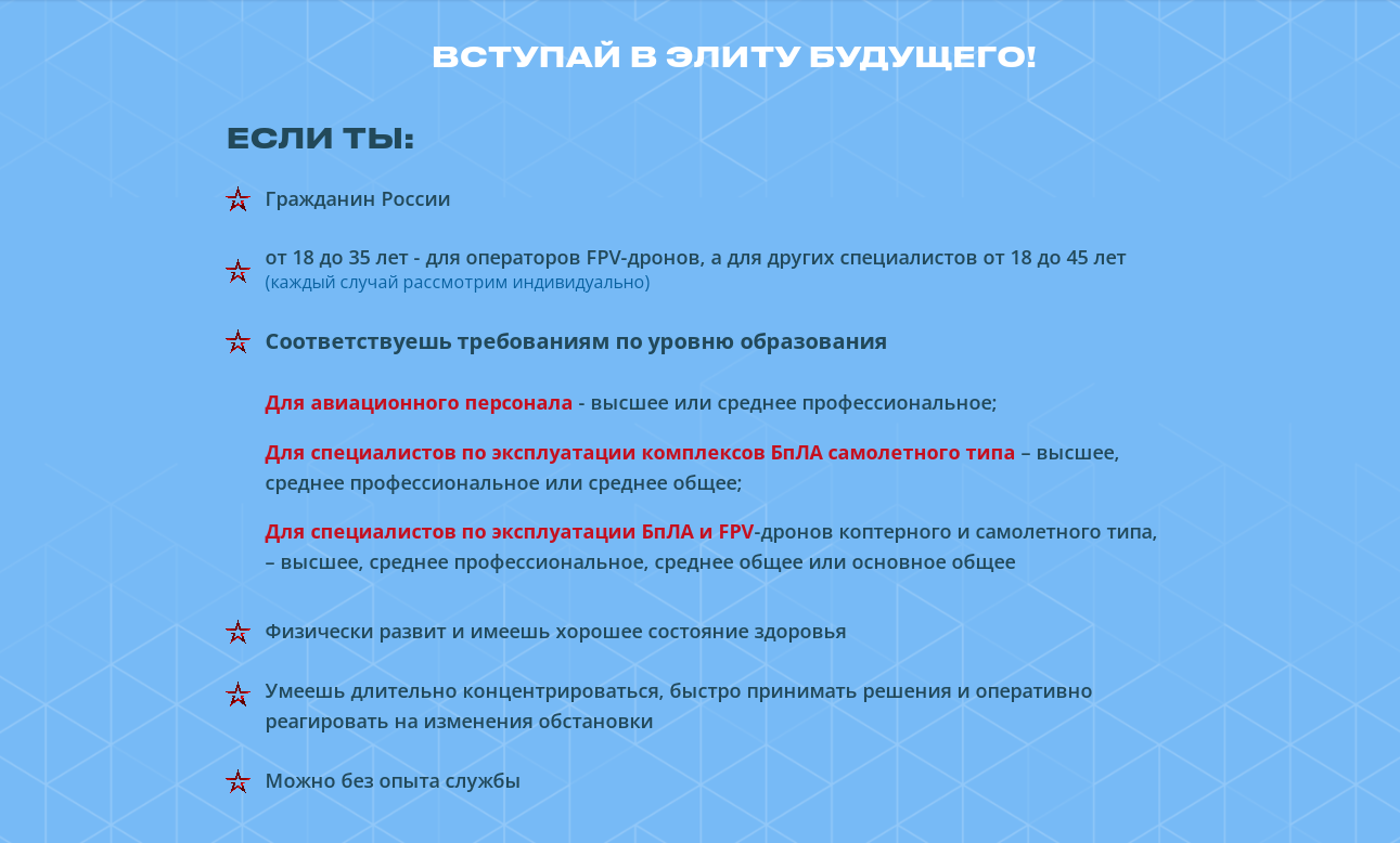 Служба включает специальную подготовку по применению современных БПЛА с возможностью заключения контракта на 1 год и его последующим продлением.